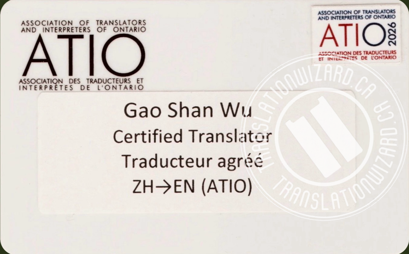 This certificate confirms that Gao Shan Wu is a Certified Translator accredited by ATIO, authorized to provide officially recognized Chinese to English translations across Canada.